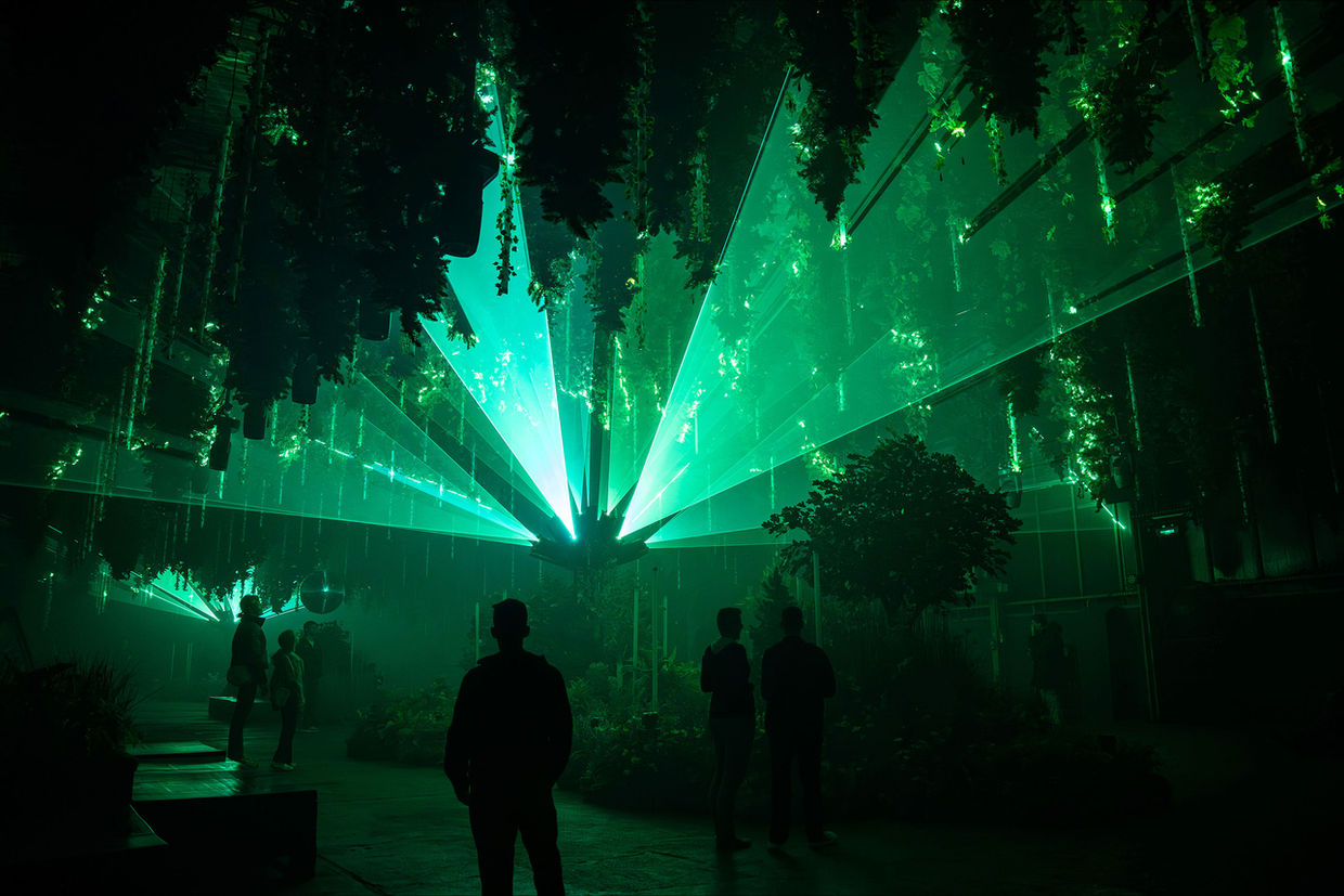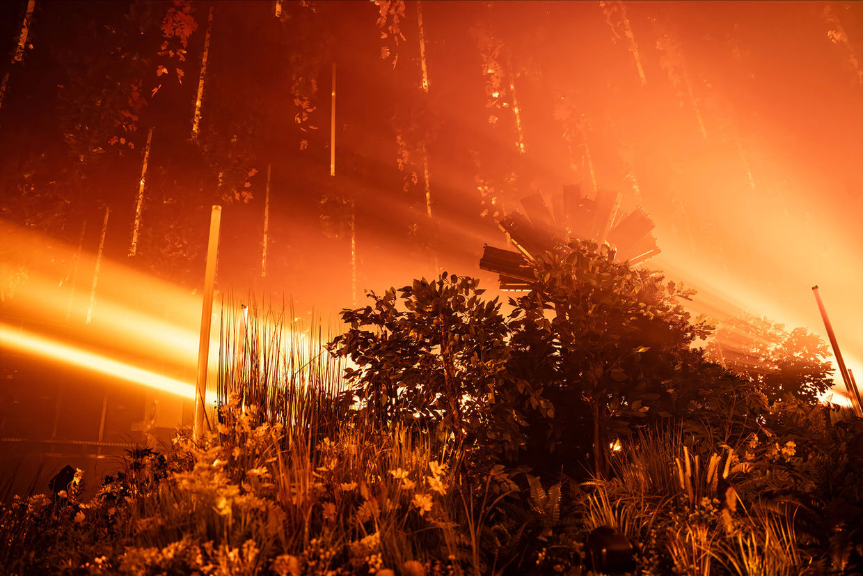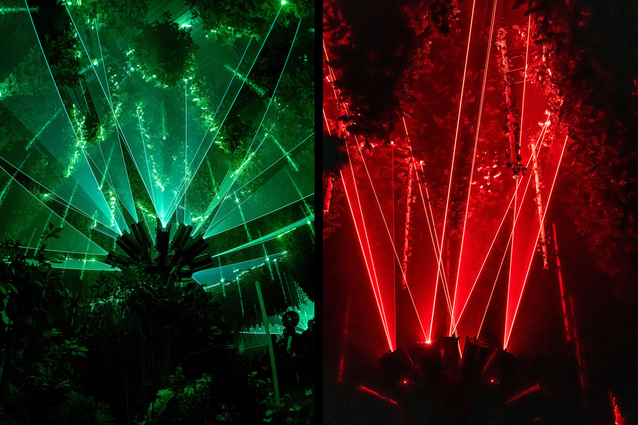 Technically, the artwork is grounded in a precisely choreographed interplay of laser light, projections, kinetic elements and sound. Abstract trees materialize in the space, crowned by modulated drawings of light. Novel, moving video projectors cast dynamic image worlds deep into the architecture. Falling leaves and artificial suns set kinetic accents. Light states, density, and mood shift continuously across a range of scenographic weather conditions.