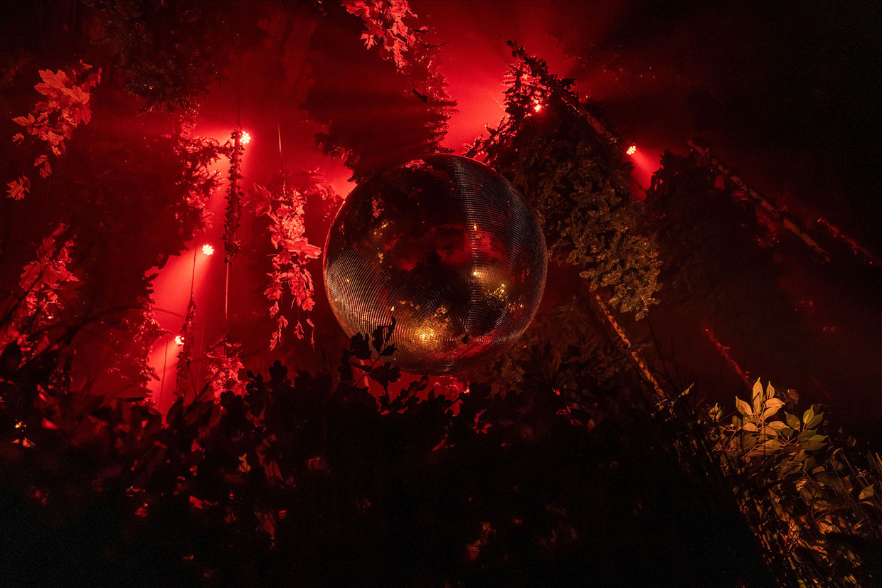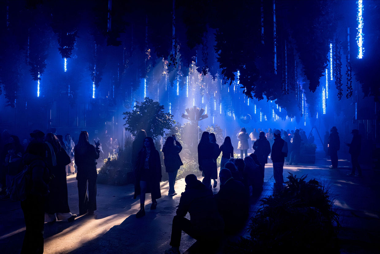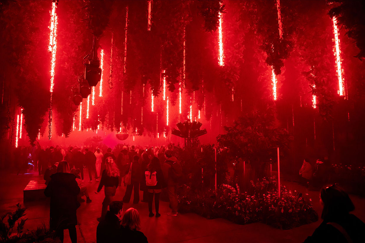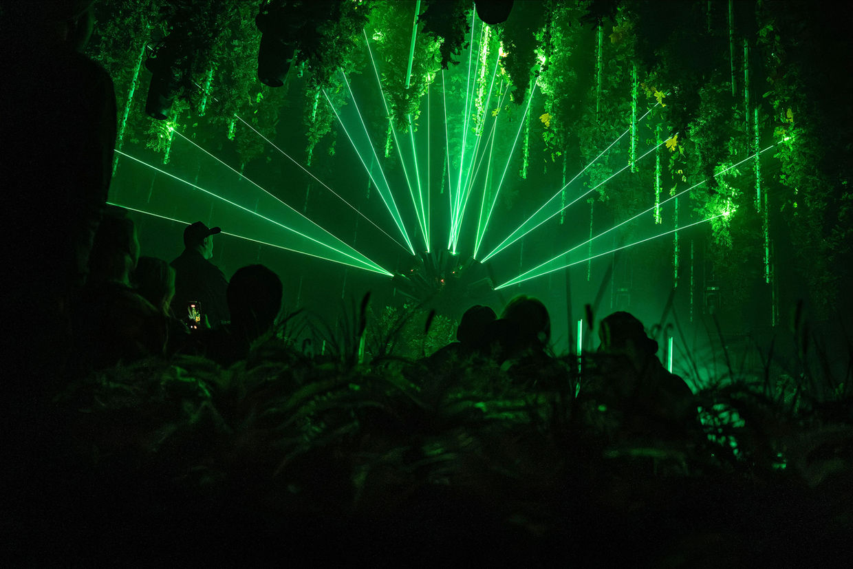 Technically, the artwork is grounded in a precisely choreographed interplay of laser light, projections, kinetic elements and sound. Abstract trees materialize in the space, crowned by modulated drawings of light. Novel, moving video projectors cast dynamic image worlds deep into the architecture. Falling leaves and artificial suns set kinetic accents. Light states, density, and mood shift continuously across a range of scenographic weather conditions.